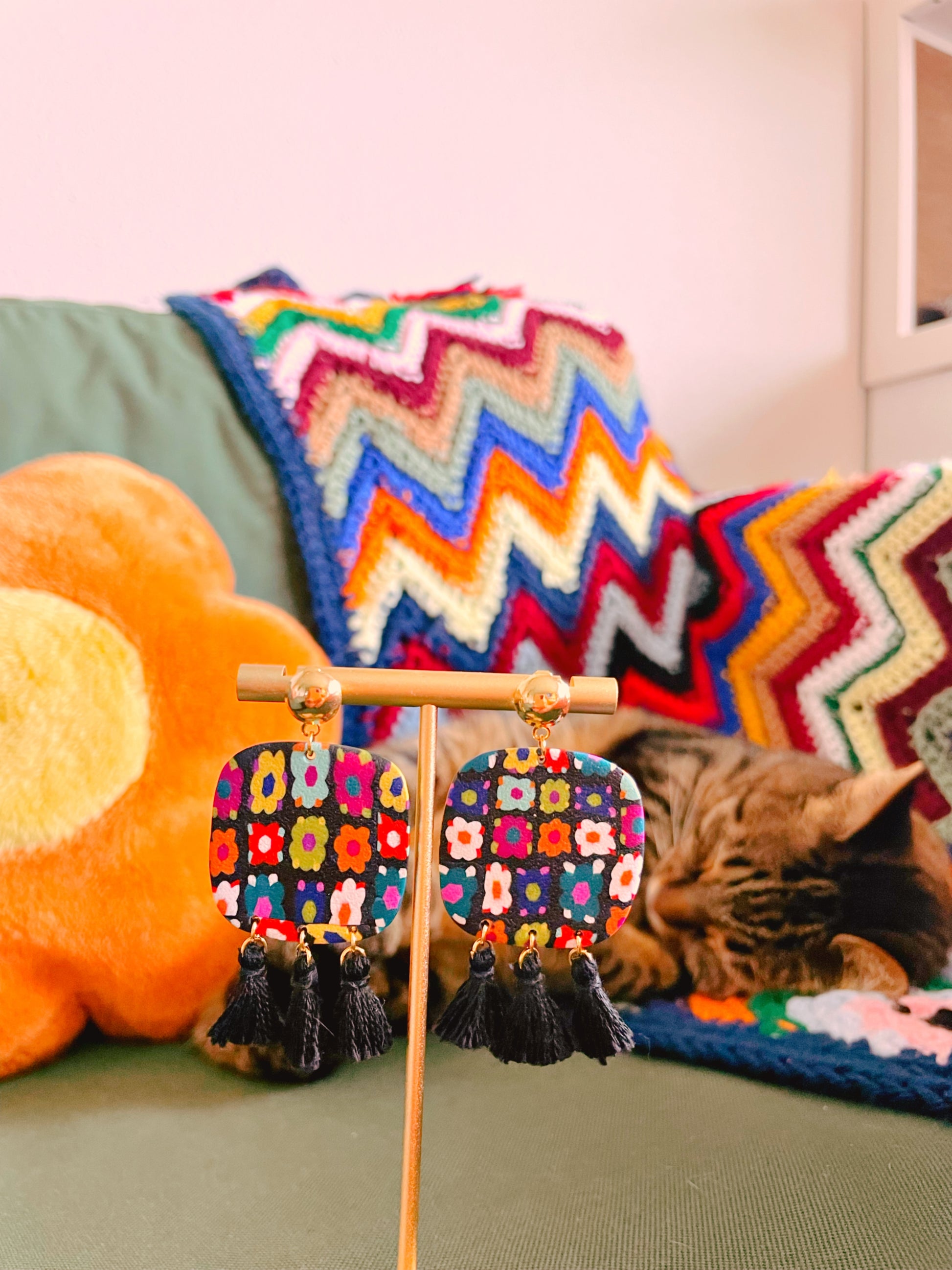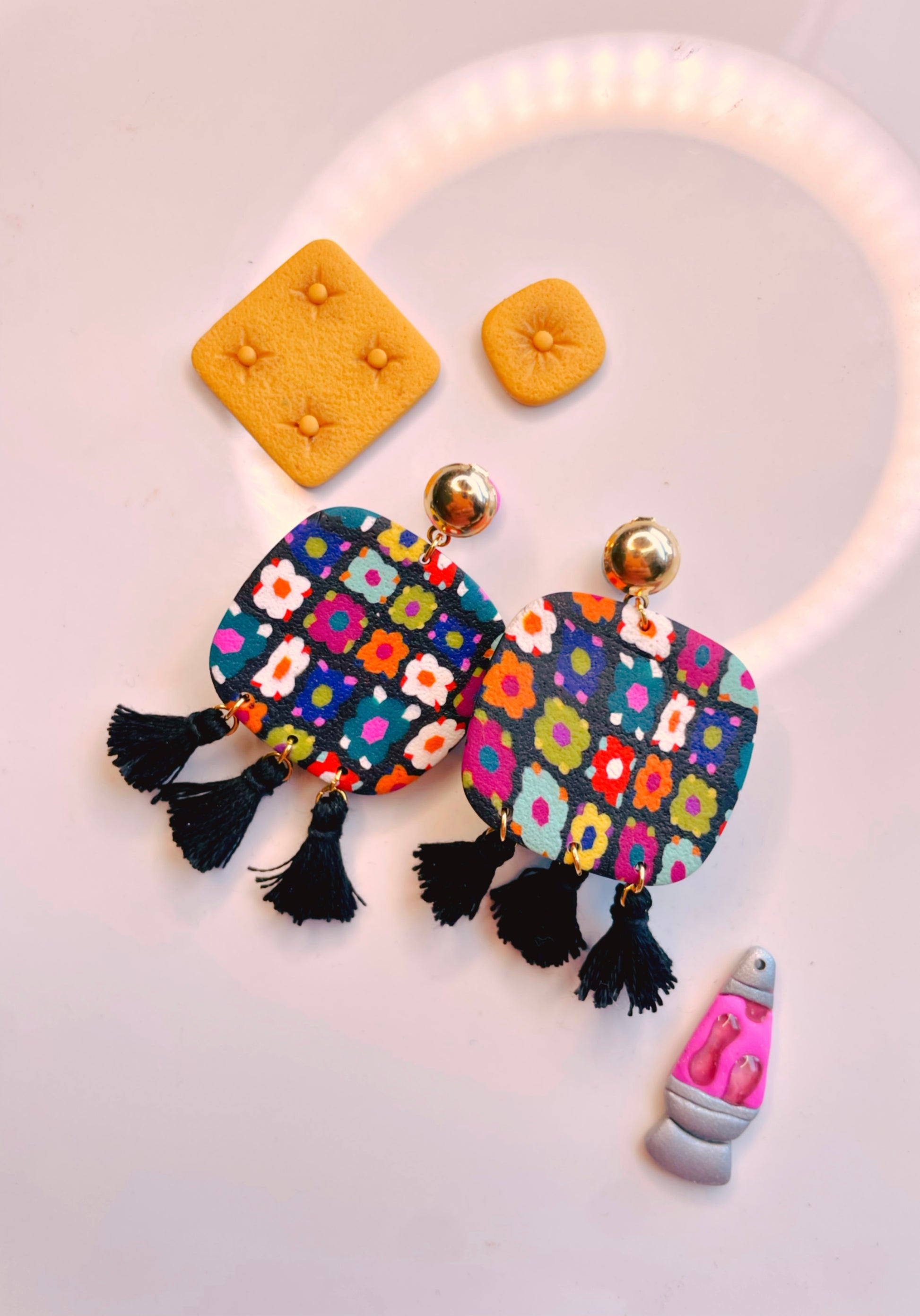 All of my earring designs are made of polymer clay and will include either stainless steel, brass, sterling silver or 14k gold-plated silver studs or hoops. They are all hypoallergenic and safe for those with sensitive ears.