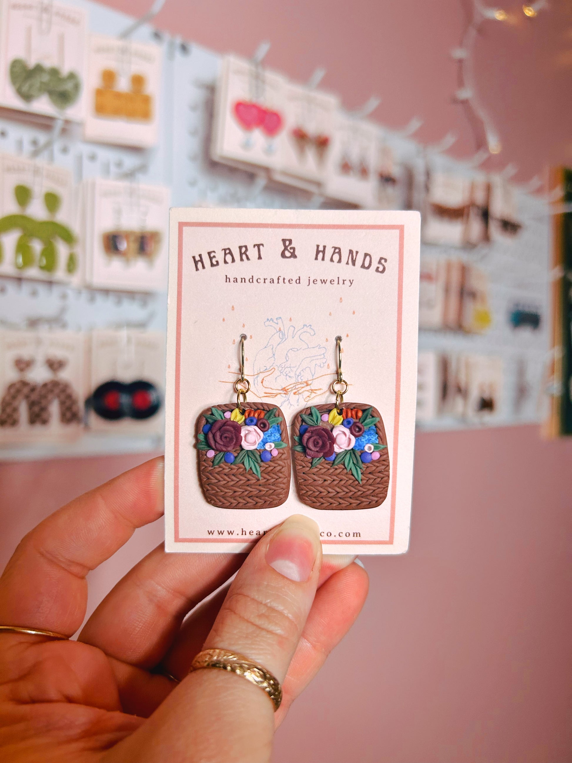 All of my earring designs are made of polymer clay and will include either stainless steel, brass, sterling silver or 14k gold-plated silver studs or hoops. They are all hypoallergenic and safe for those with sensitive ears.