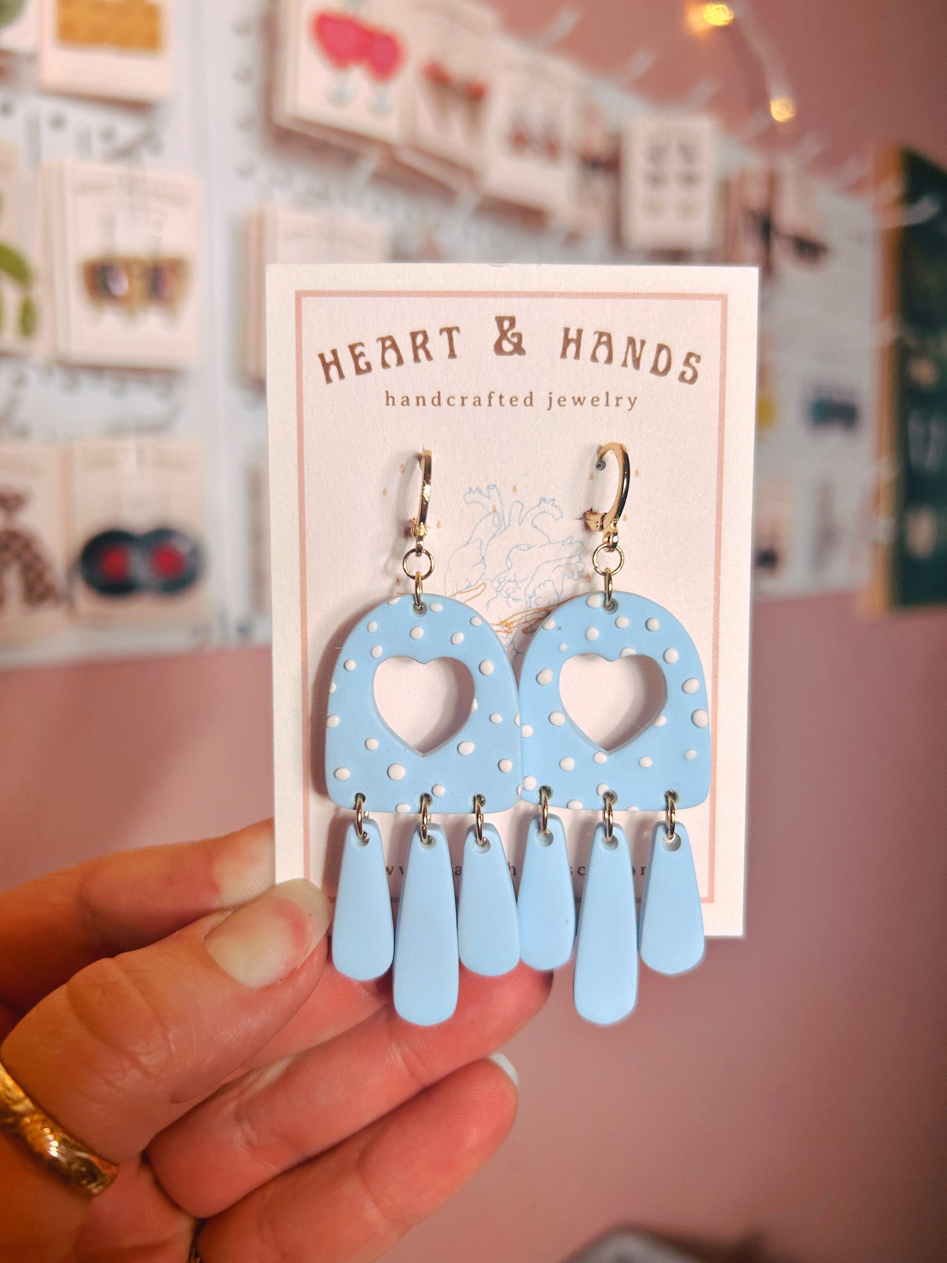 All of my earring designs are made of polymer clay and will include either stainless steel, brass, sterling silver or 14k gold-plated silver studs or hoops. They are all hypoallergenic and safe for those with sensitive ears.