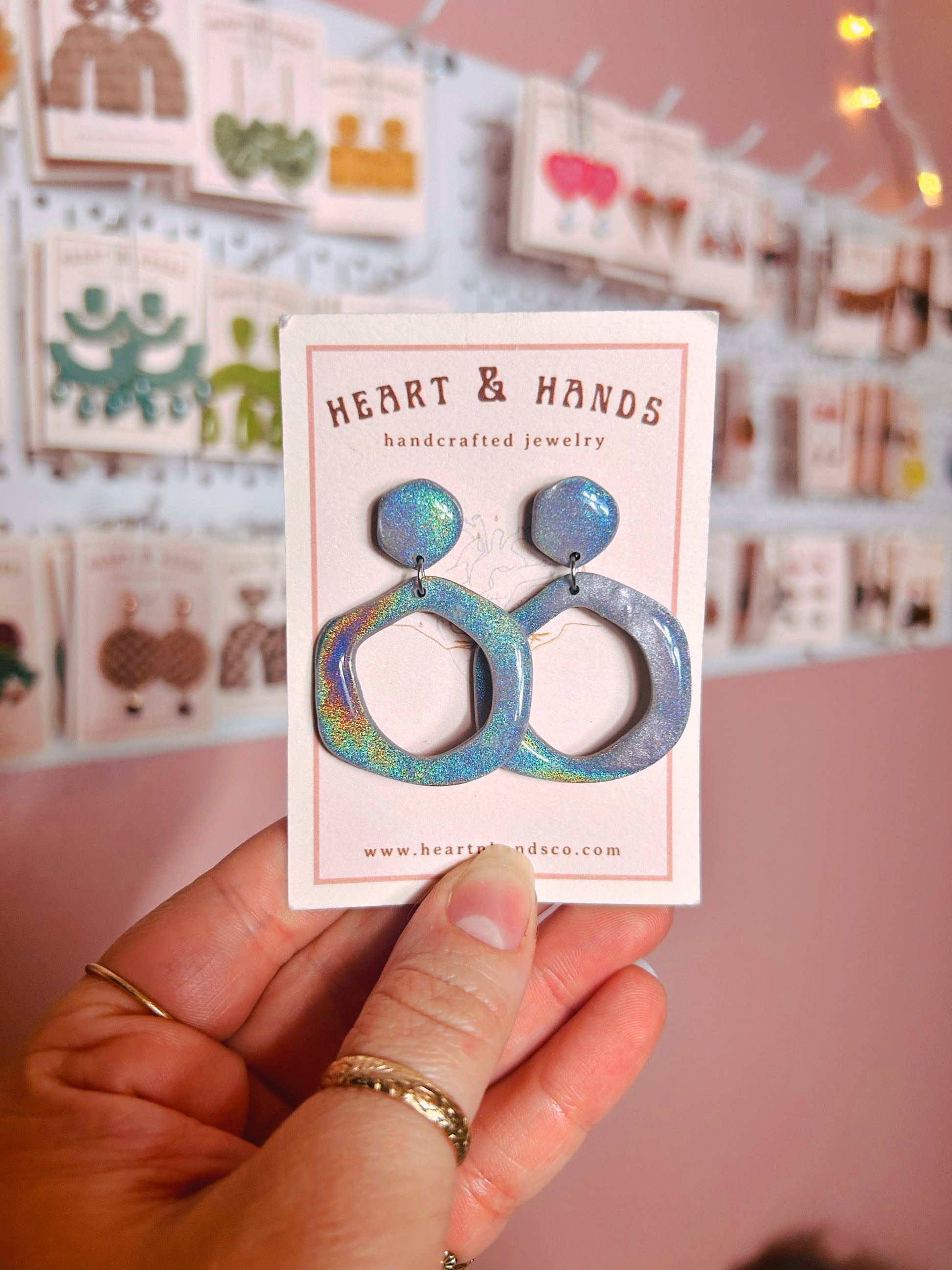 All of my earring designs are made of polymer clay and will include either stainless steel, brass, sterling silver or 14k gold-plated silver studs or hoops. They are all hypoallergenic and safe for those with sensitive ears.