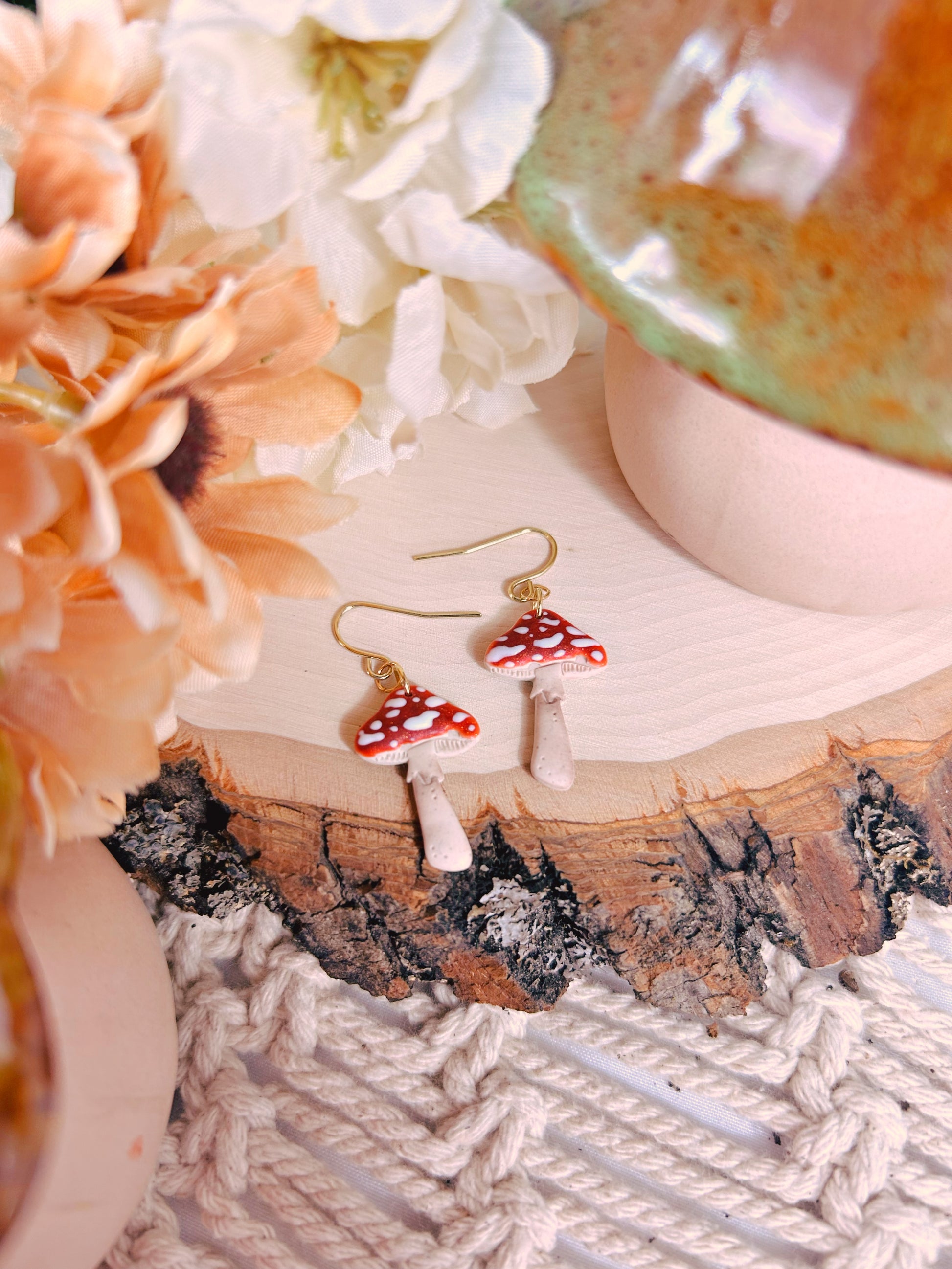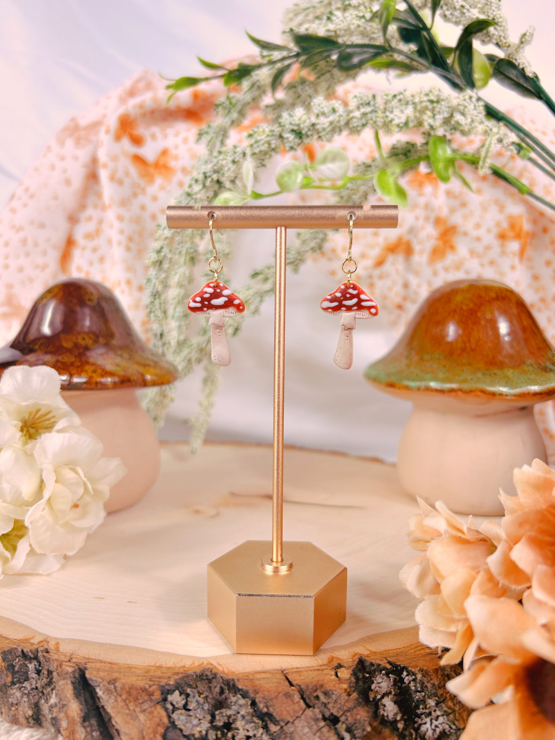 All of my earring designs are made of polymer clay and will include either stainless steel, brass, sterling silver or 14k gold-plated silver studs or hoops. They are all hypoallergenic and safe for those with sensitive ears.