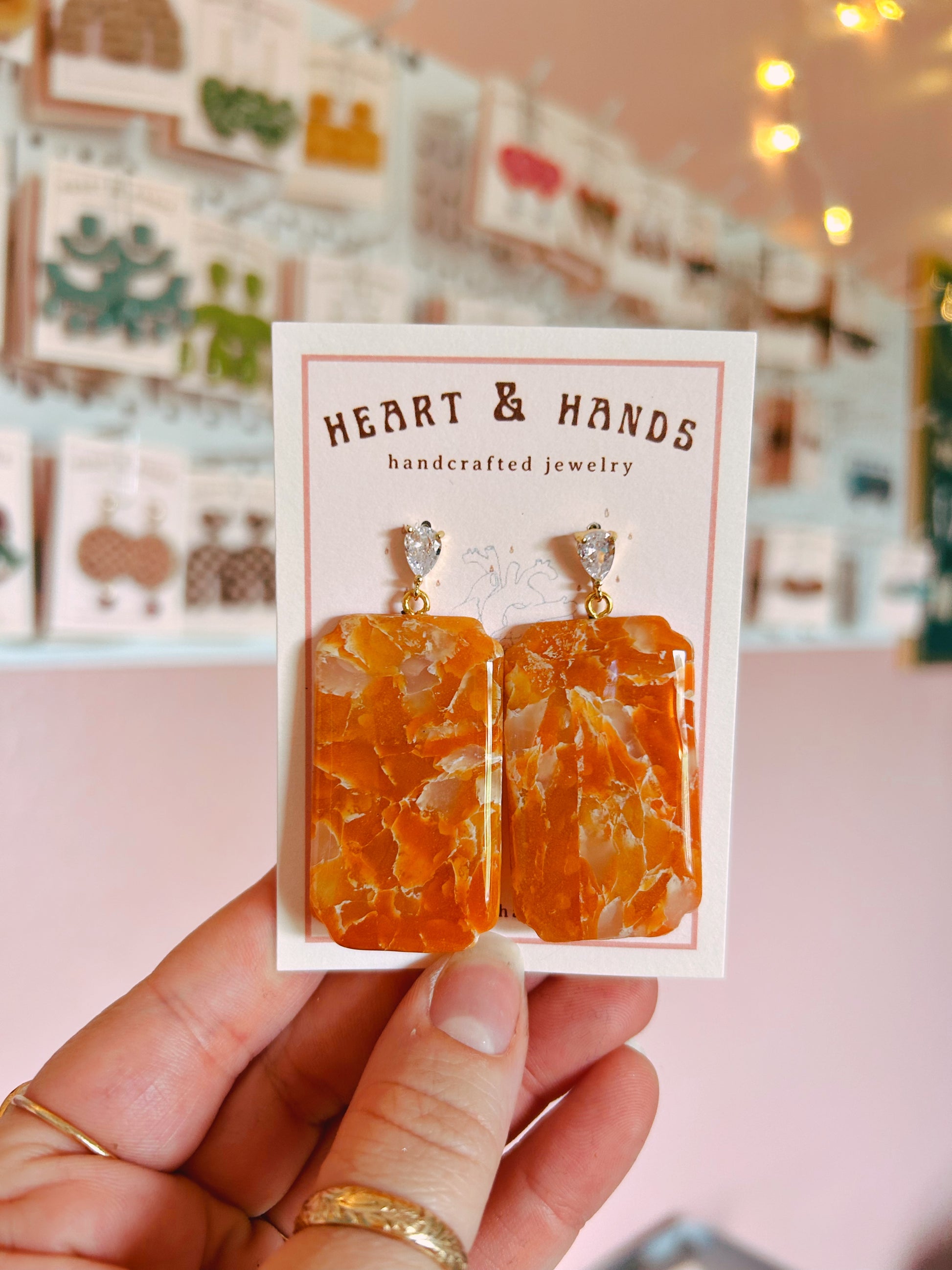 All of my earring designs are made of polymer clay and will include either stainless steel, brass, sterling silver or 14k gold-plated silver studs or hoops. They are all hypoallergenic and safe for those with sensitive ears.