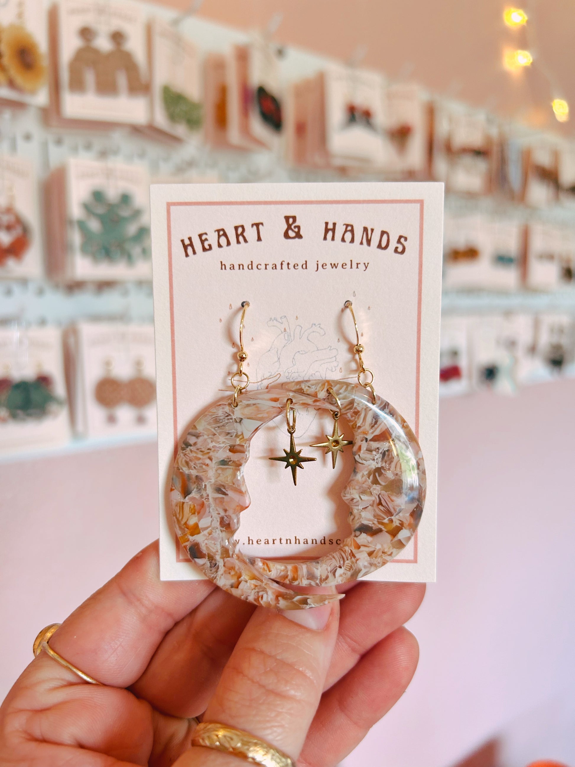 All of my earring designs are made of polymer clay and will include either stainless steel, brass, sterling silver or 14k gold-plated silver studs or hoops. They are all hypoallergenic and safe for those with sensitive ears.