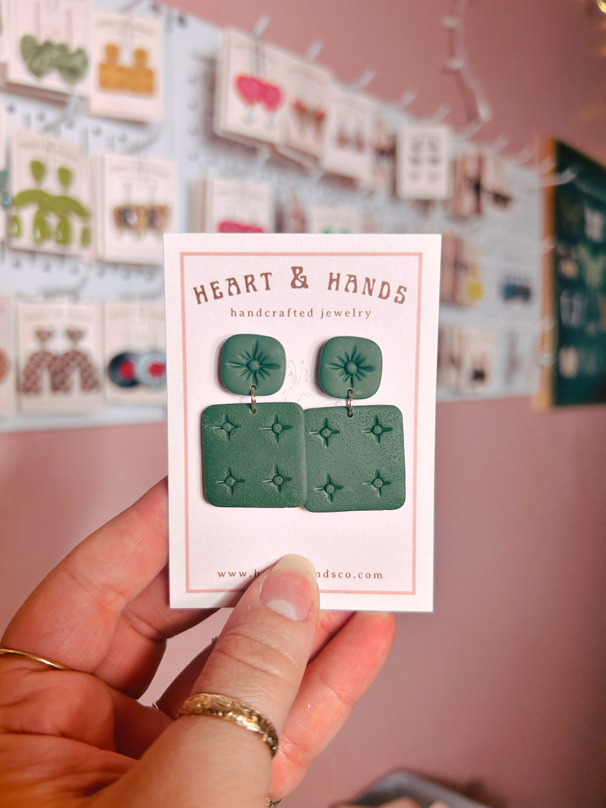 All of my earring designs are made of polymer clay and will include either stainless steel, brass, sterling silver or 14k gold-plated silver studs or hoops. They are all hypoallergenic and safe for those with sensitive ears.