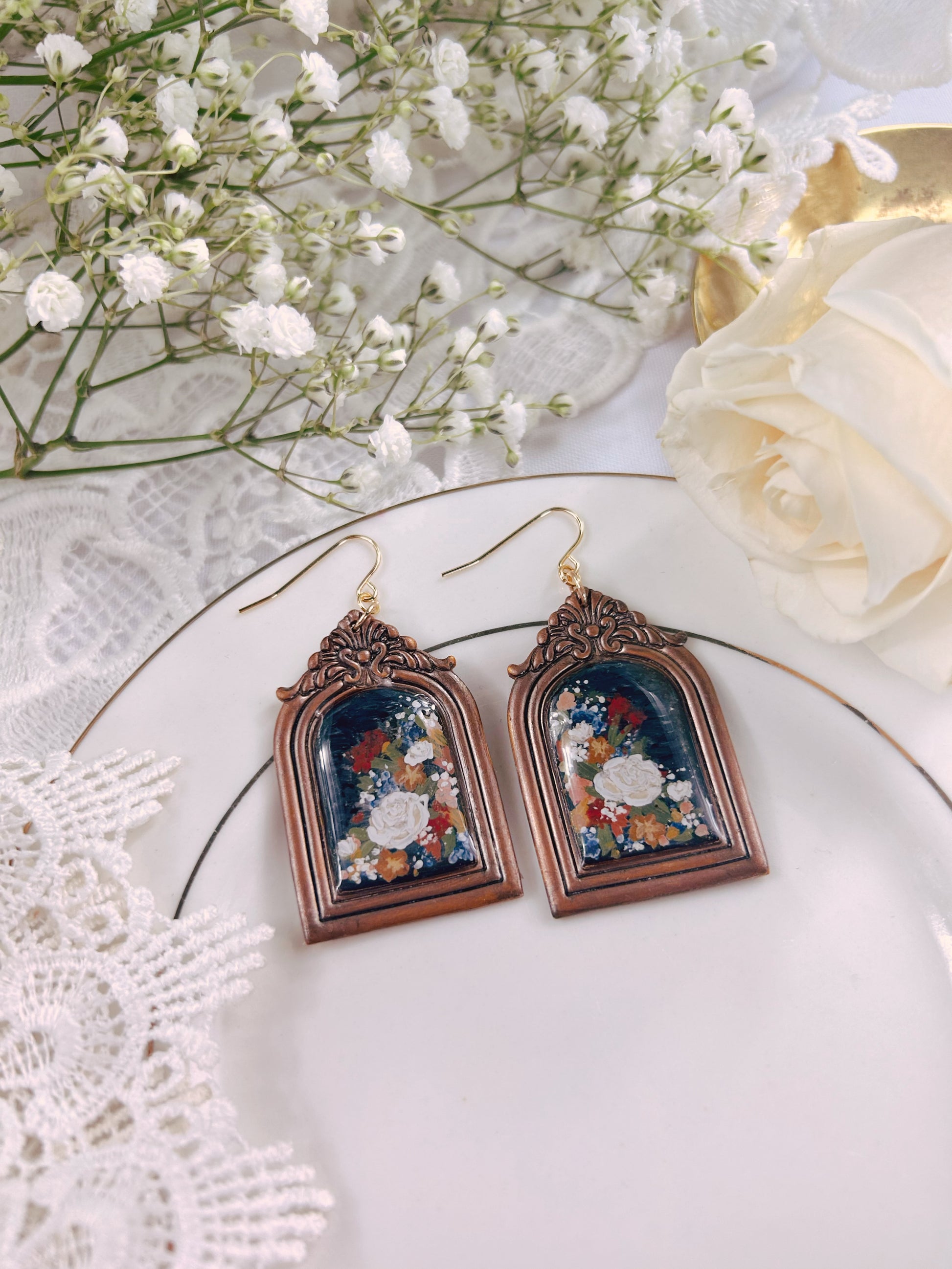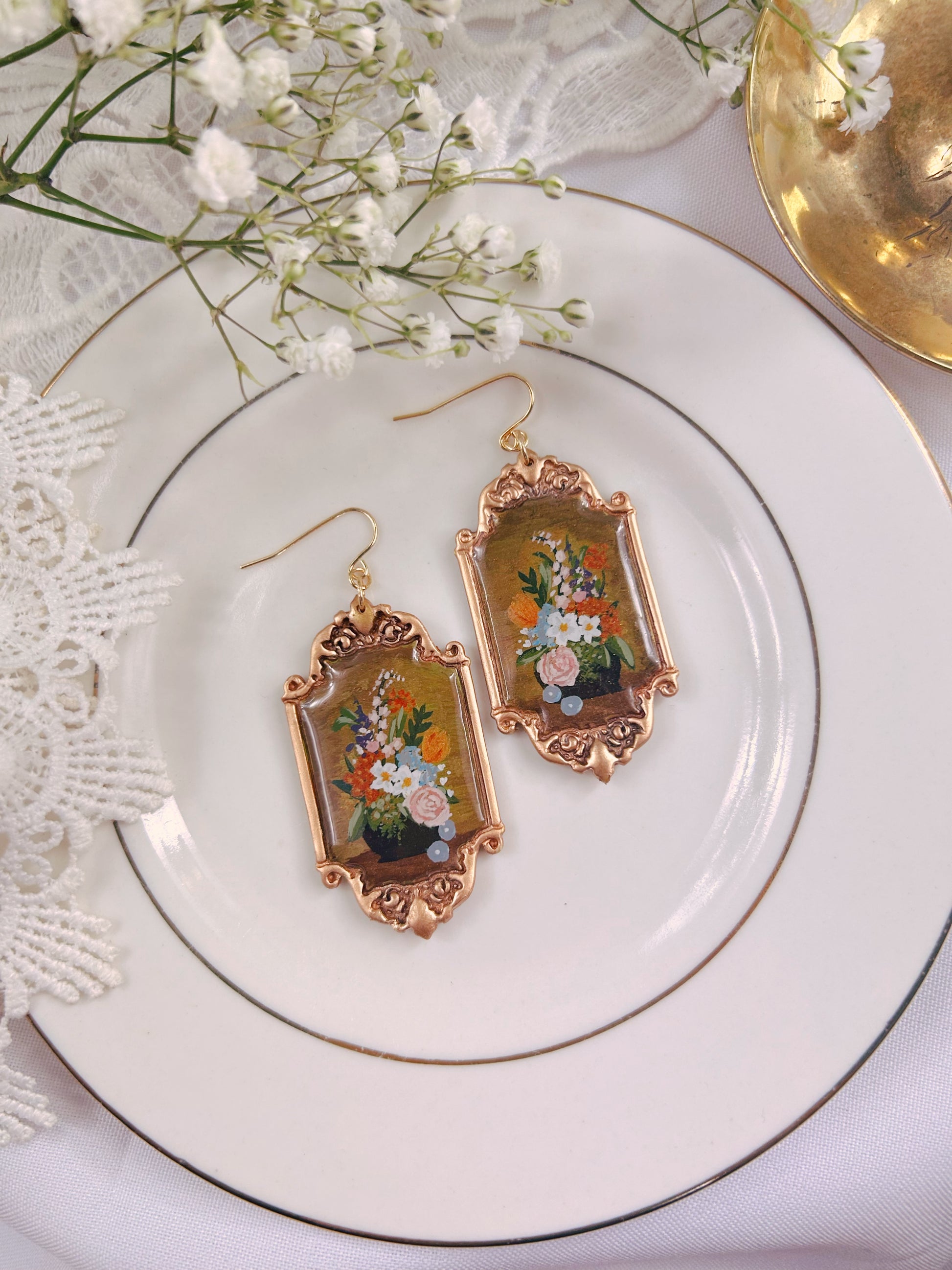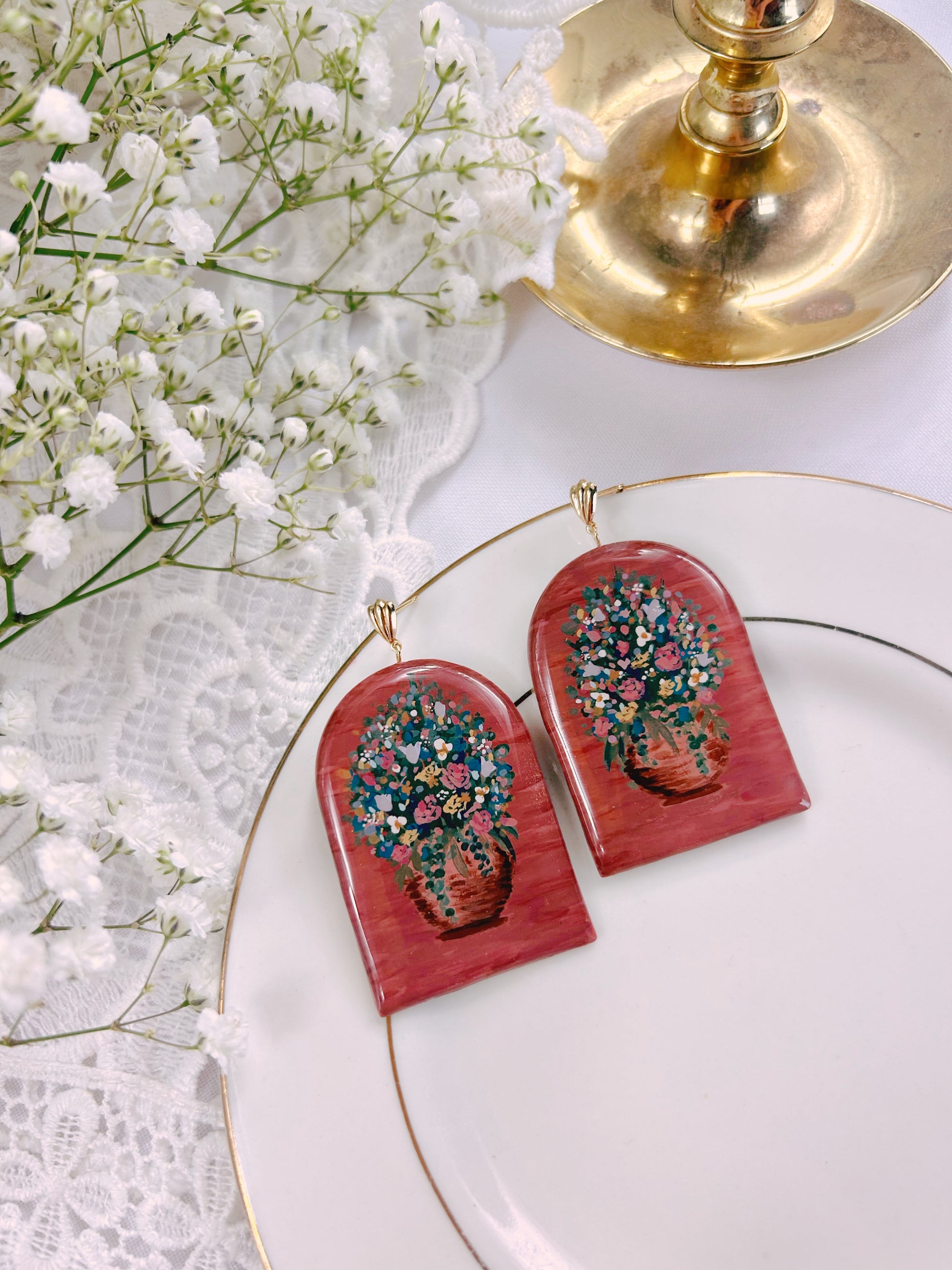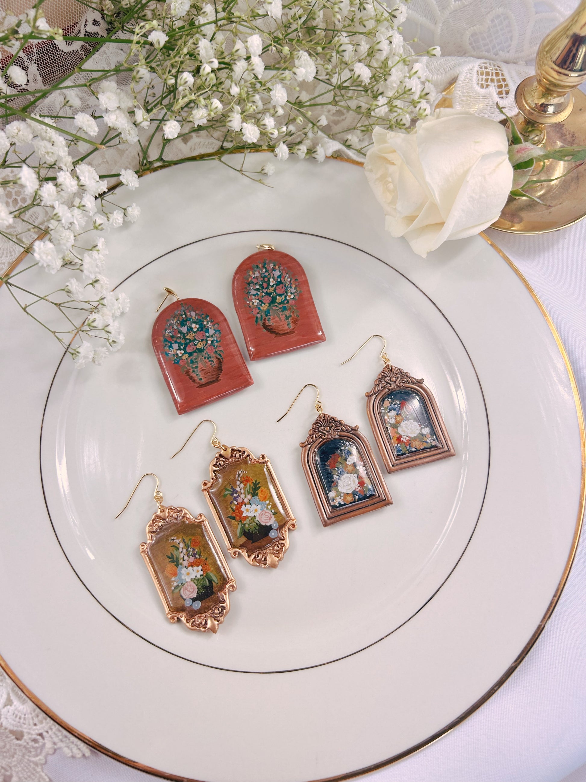 All of my earring designs are made of polymer clay and will include either stainless steel, brass, sterling silver or 14k gold-plated silver studs or hoops. They are all hypoallergenic and safe for those with sensitive ears.