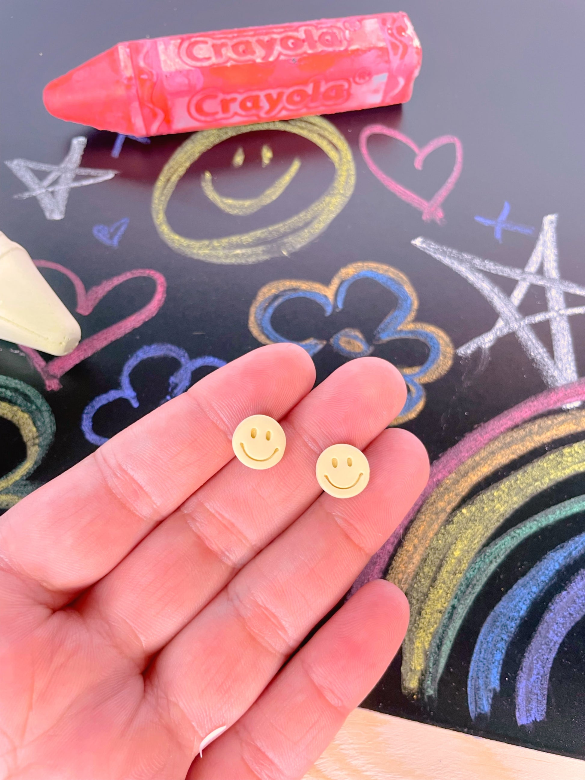 All of my earring designs are made of polymer clay and will include either stainless steel, brass, sterling silver or 14k gold-plated silver studs or hoops. They are all hypoallergenic and safe for those with sensitive ears.